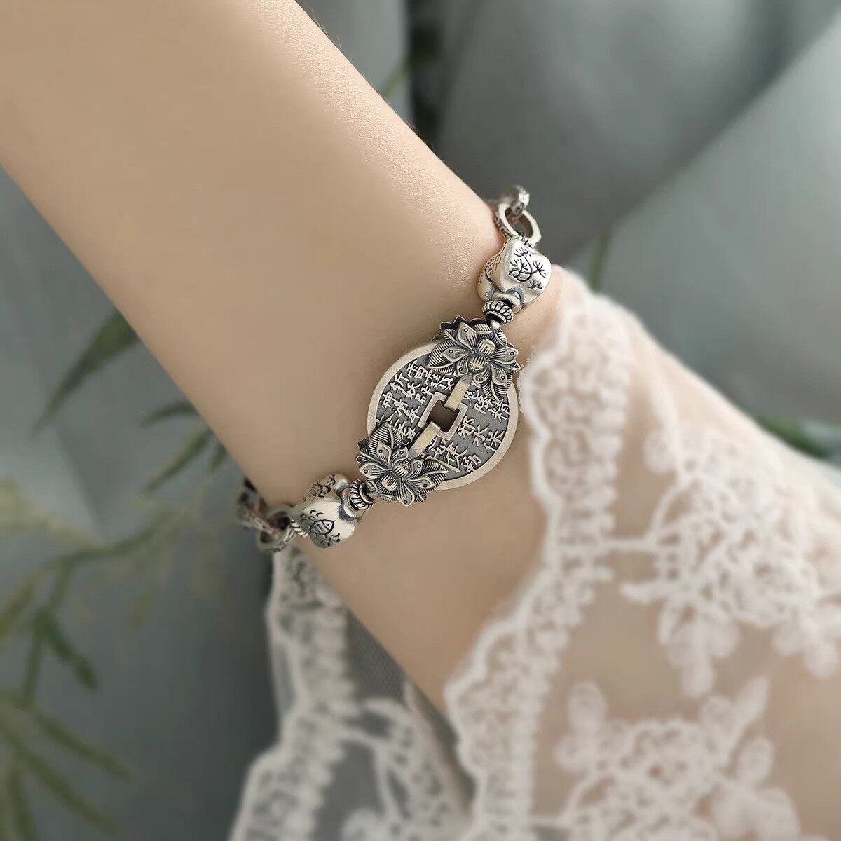 925银复古新中式莲蓬山鬼花钱圆牌手链民族风女士小众设计高级感