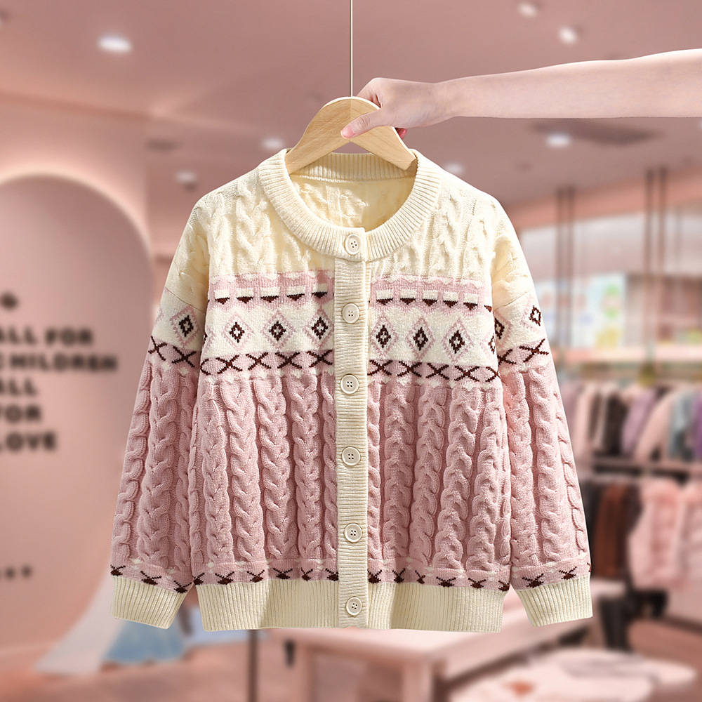 2024女童秋冬加厚毛衣开衫女孩圆领单排扣外套针织衫中大儿童上衣