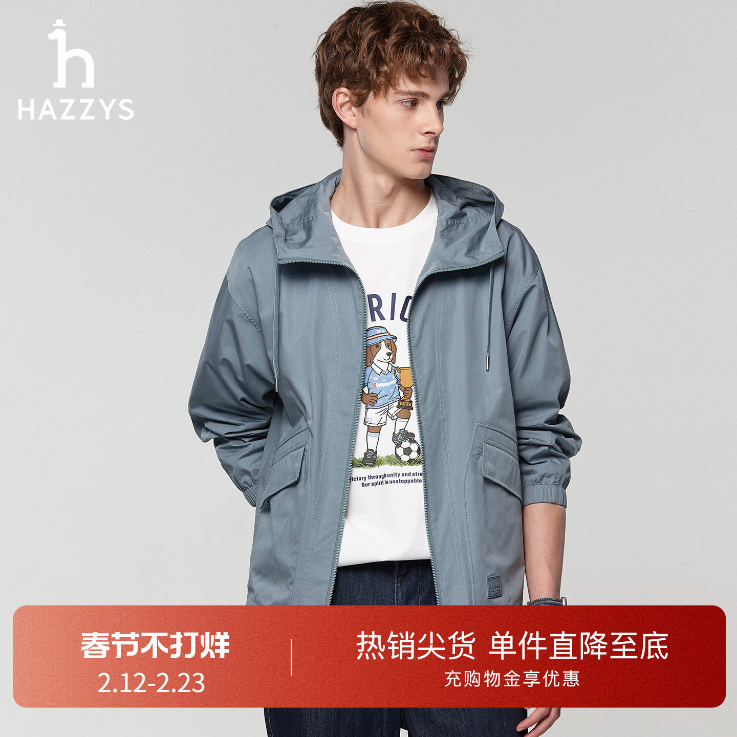 【春夏甄选】Hazzys哈吉斯春款男装休闲通勤连帽夹克净色外套上衣