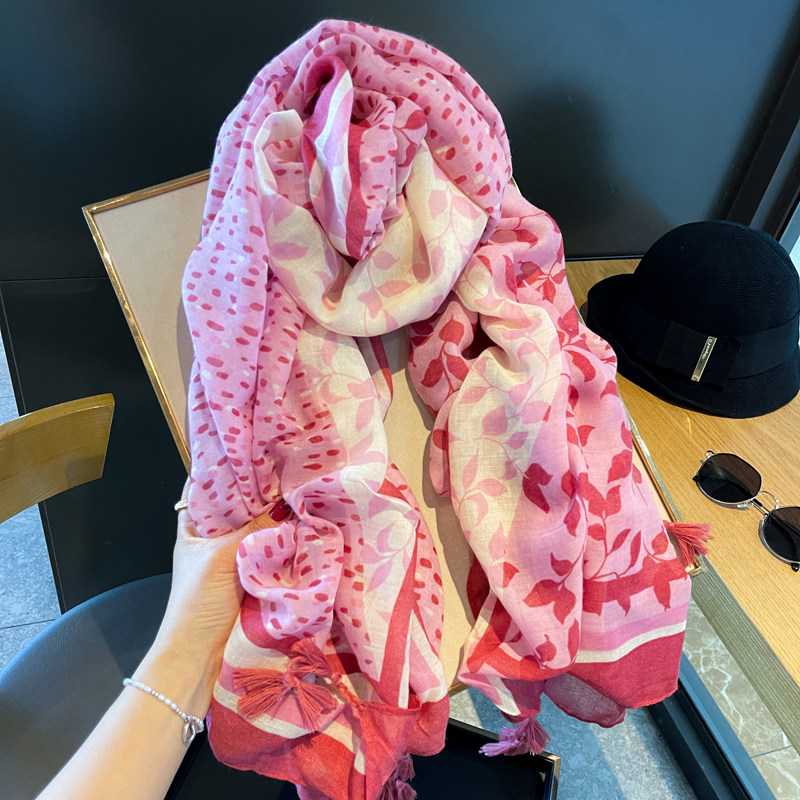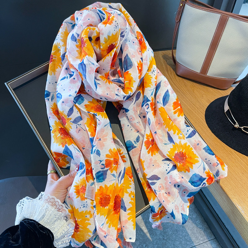 防晒棉麻围巾女百搭春夏花卉丝巾海边旅游大披肩沙滩巾长款薄纱巾