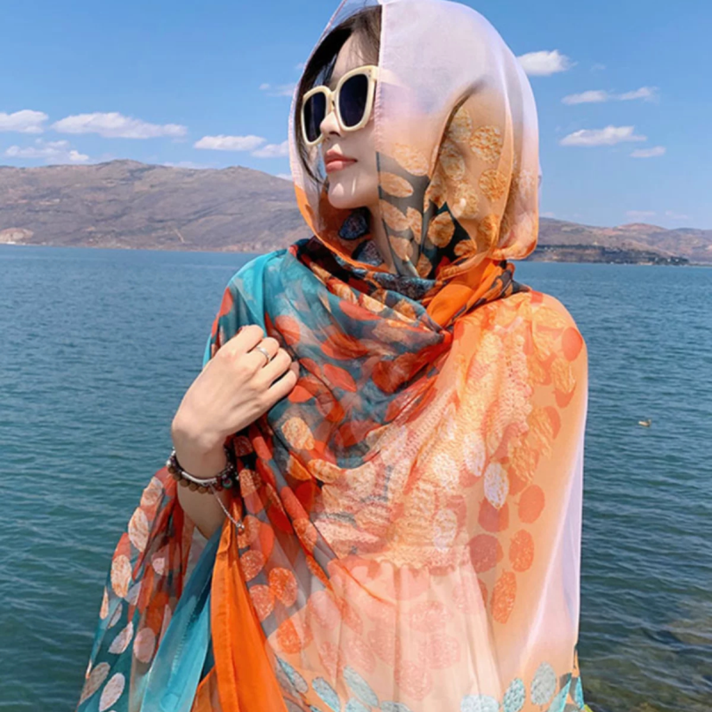 杭州丝巾春夏印花纱巾女长款超大雪纺空调披肩百搭海边防晒沙滩巾