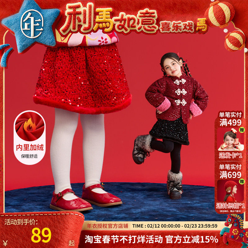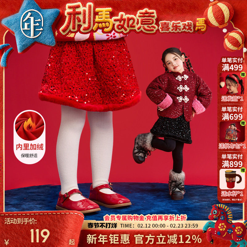LittleNaive儿童红色节日半裙冬裙子加绒人鱼半裙女童亮片半身裙