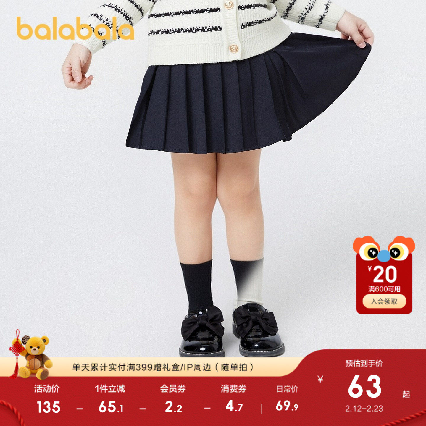 巴拉巴拉儿童裙子春秋装童装女童短裙百褶半身裙学院风舒适百搭萌