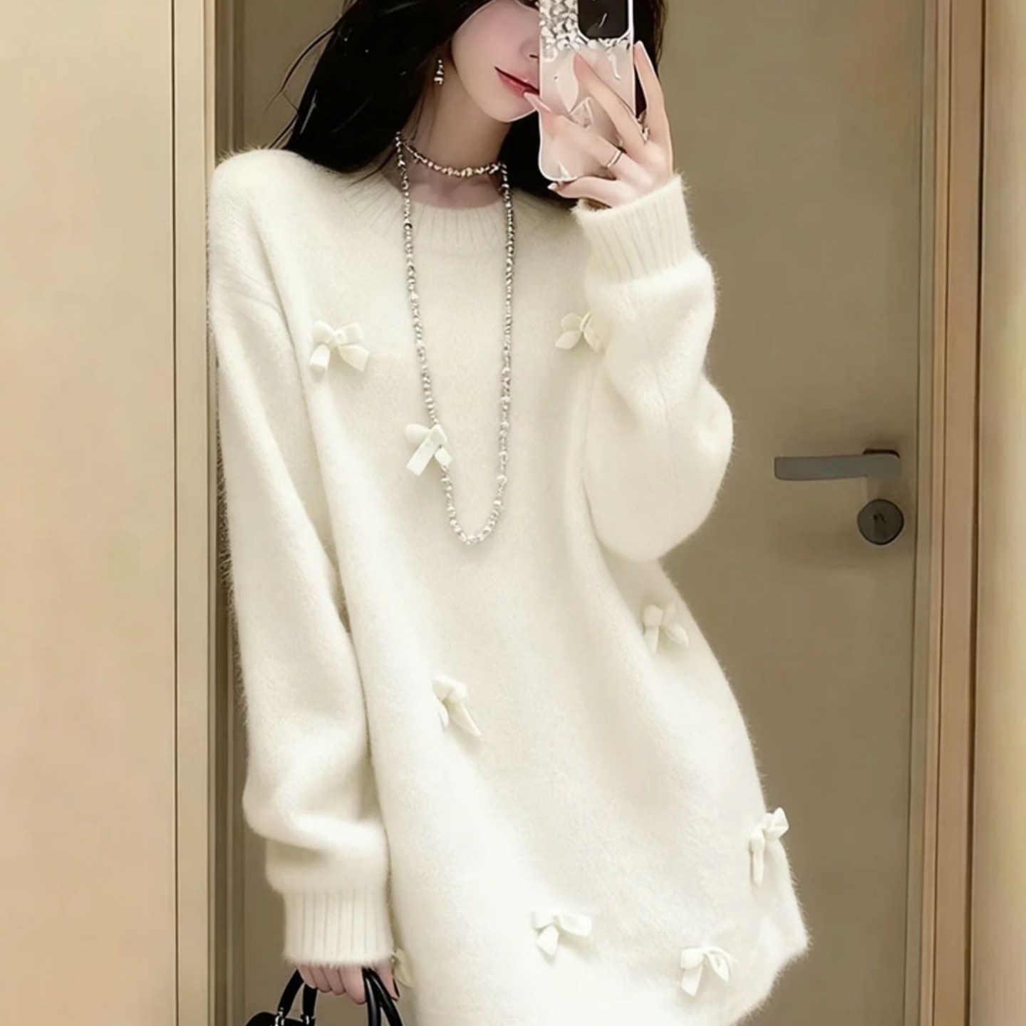 蝴蝶结中长款毛衣裙女秋冬2025新款宽松慵懒风圆领套头针织打底衫
