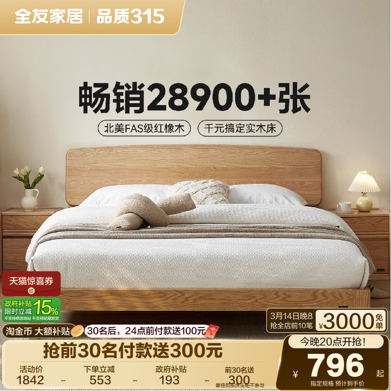 政府补贴全友家居实木悬浮床橡木1米5单人床架卧室1米8双人储物床
