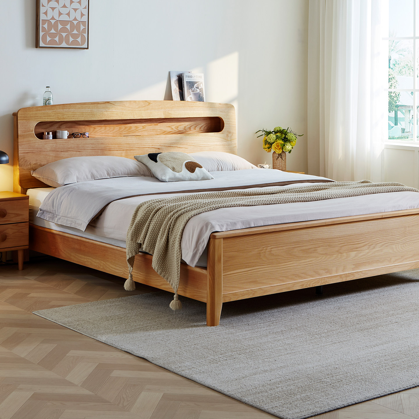 一林半舍北欧简约全实木床双人榫卯床原木色床头带夜灯置物储物床