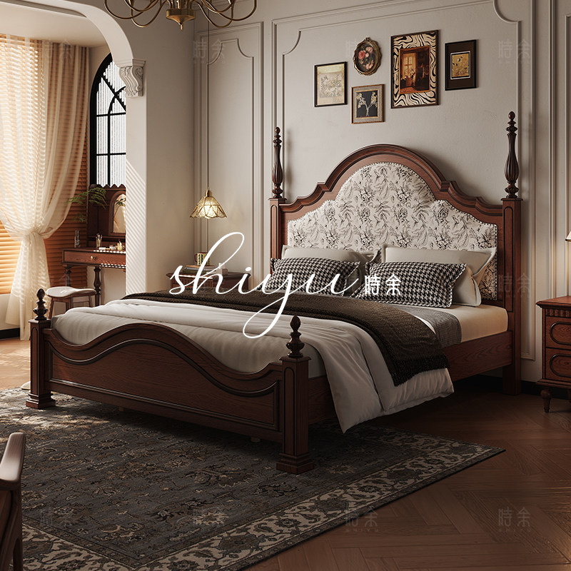 时余茉尔实木床双人美式复古乡村雕花床1米8婚床法式中古软包床