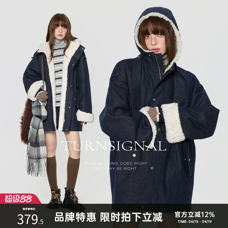 TurnSignal长款连帽加绒外套女冬季加厚休闲宽松保暖中长款外套