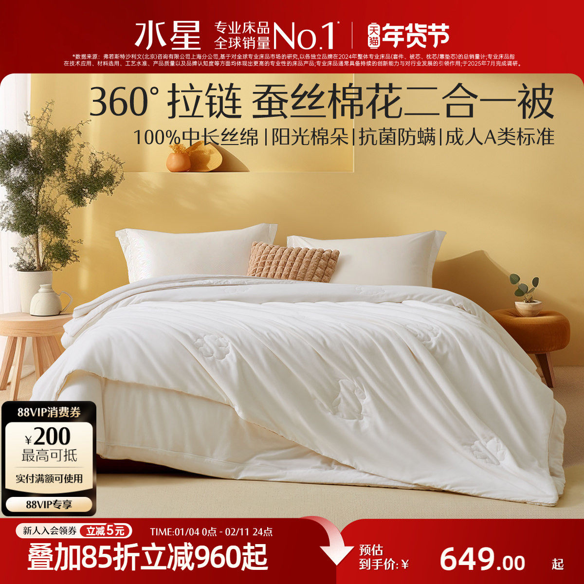 水星家纺100%蚕丝被A类抑菌二合一被保暖冬被被芯春秋被子年货礼