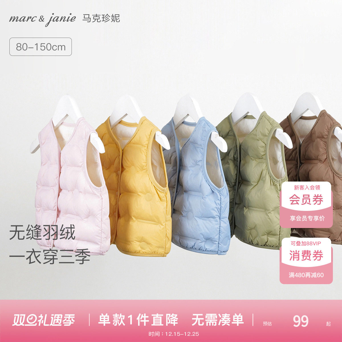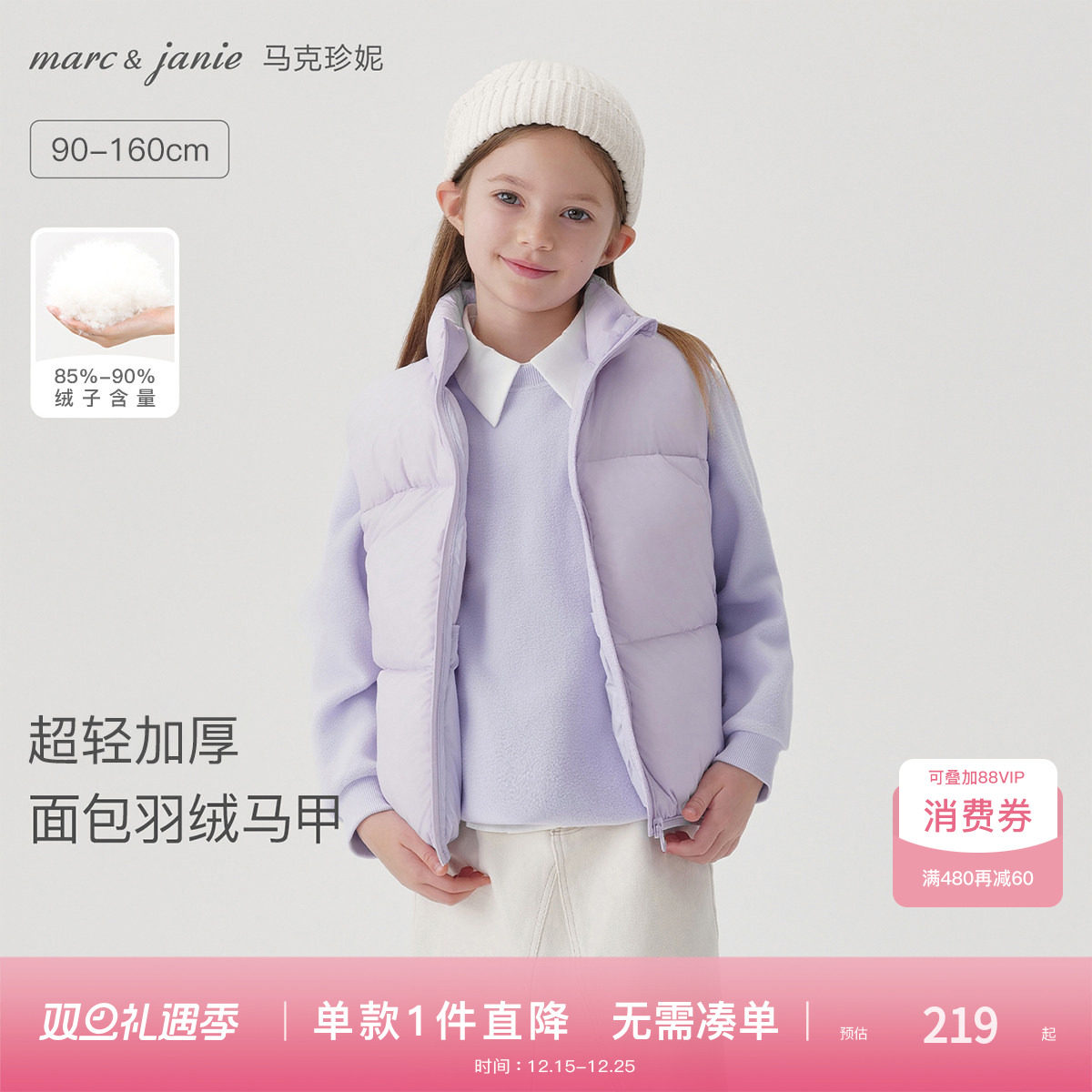 [三防]马克珍妮男女童超轻加厚面包羽绒服马甲儿童2025冬装551111