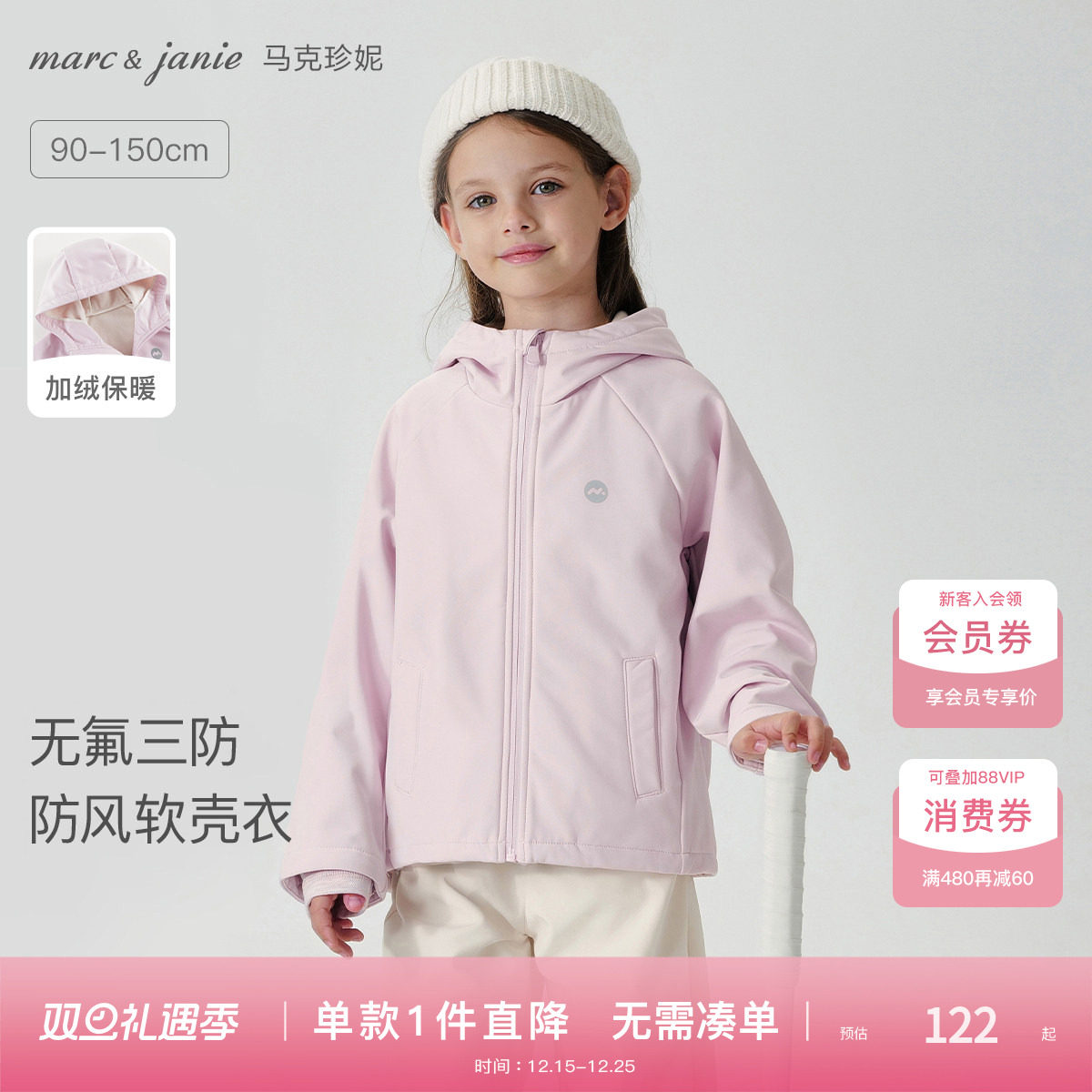 马克珍妮男女童三防连帽软壳衣红色加绒外套儿童夹克秋冬装241139