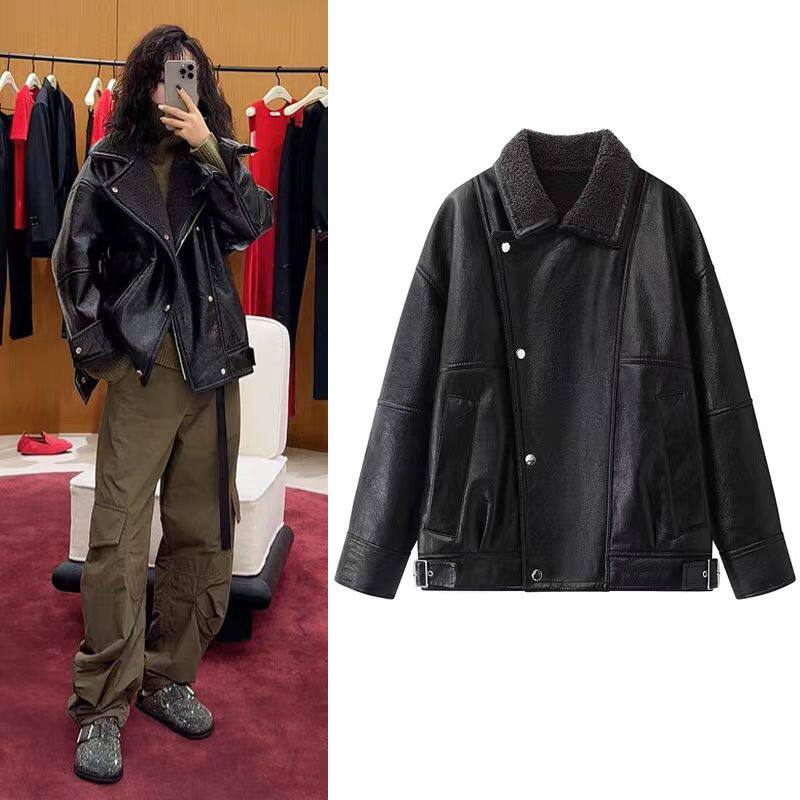 2025冬季新款美式复古机车羊羔绒皮衣外套女加厚宽松大衣夹克上衣