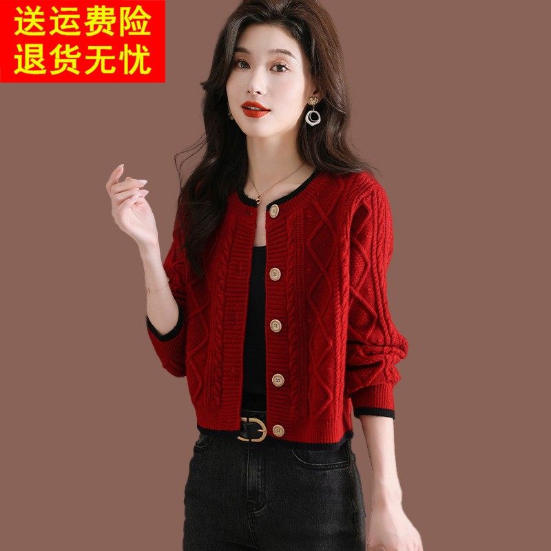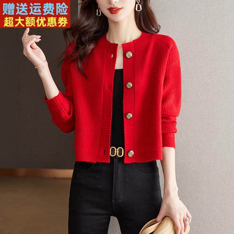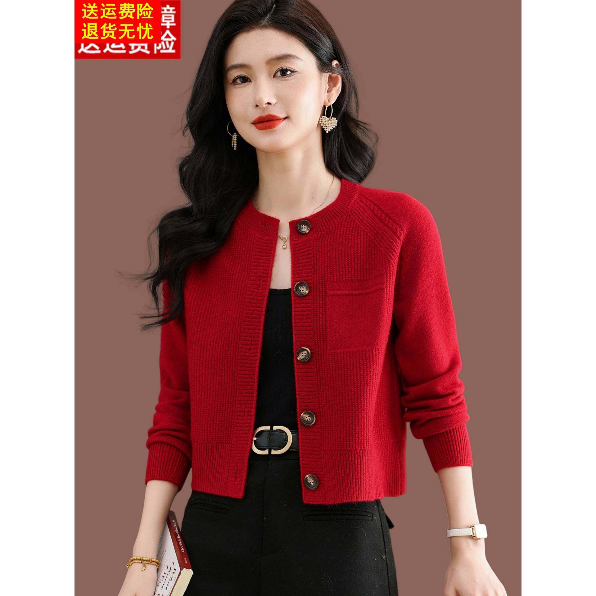 圆领毛衣外套女秋季高腰短款配裙子红色上衣外搭小款羊毛针织开衫