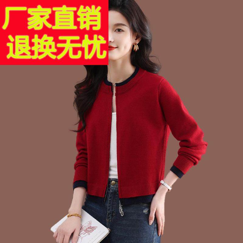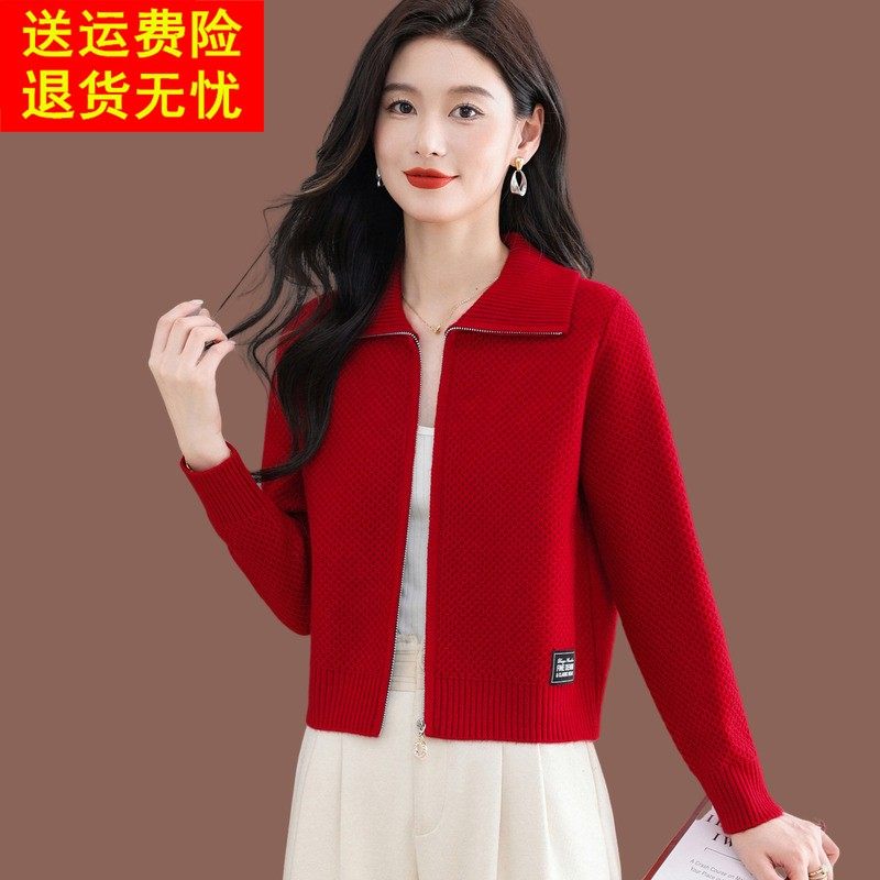 翻领拉链毛衣外套女秋季新款红色上衣洋气小款配裙子外搭羊毛开衫