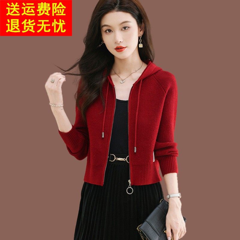 连帽高腰毛衣外套女秋冬时尚短款配裙子小款外搭红色羊毛针织开衫