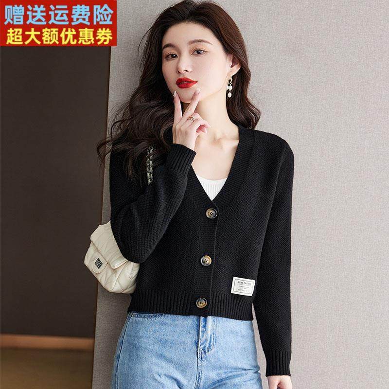 春秋时尚V领毛衣女超短款小个子宽松开衫高腰小款针织衫外套外穿