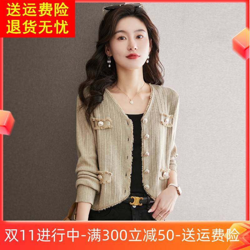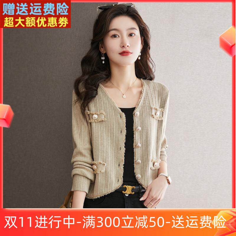 春秋时尚V领毛衣女高腰超短款小香风针织开衫小款外套配裙子上衣