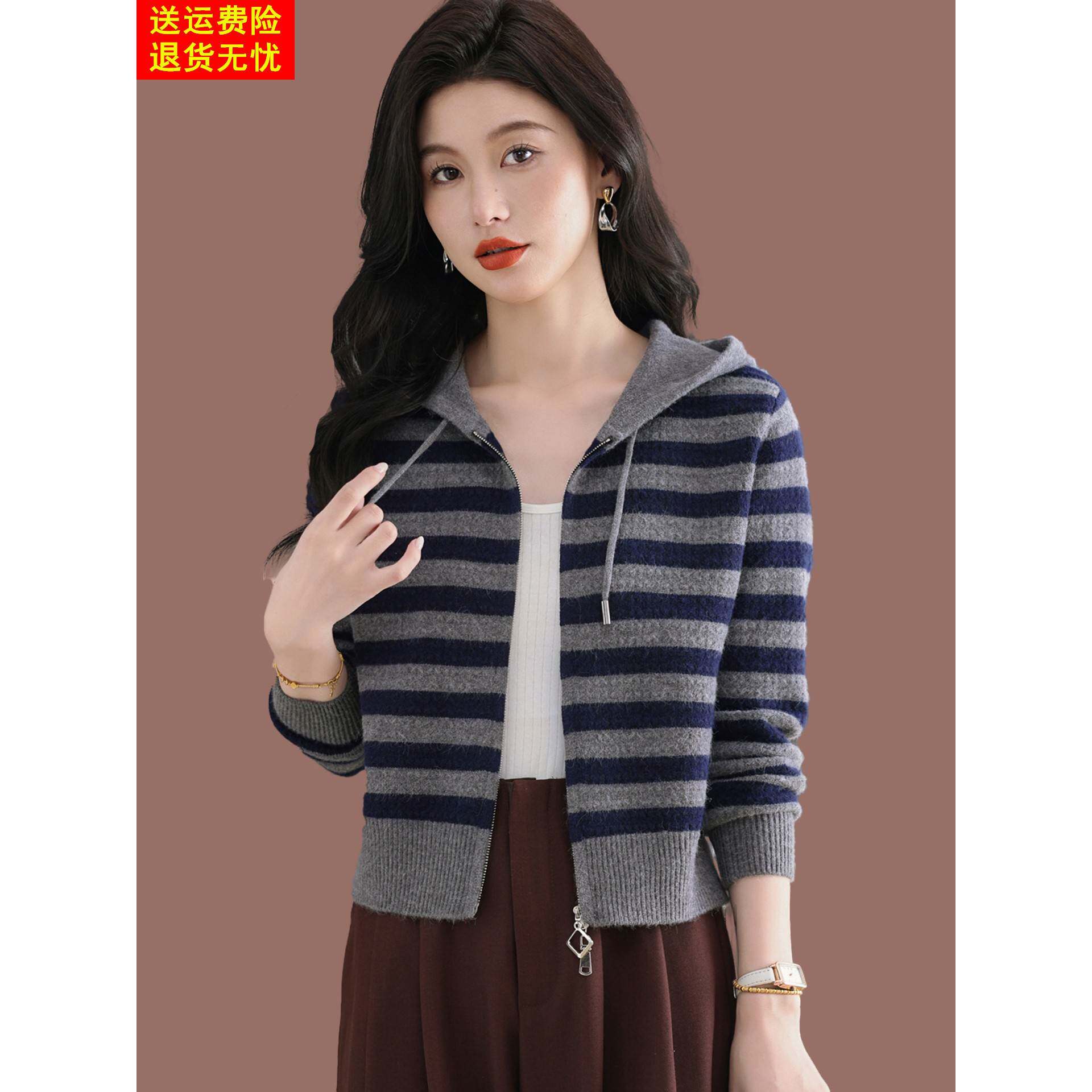 短款高腰连帽上衣小款毛衣外套春秋新款长袖时尚条纹羊毛针织开衫