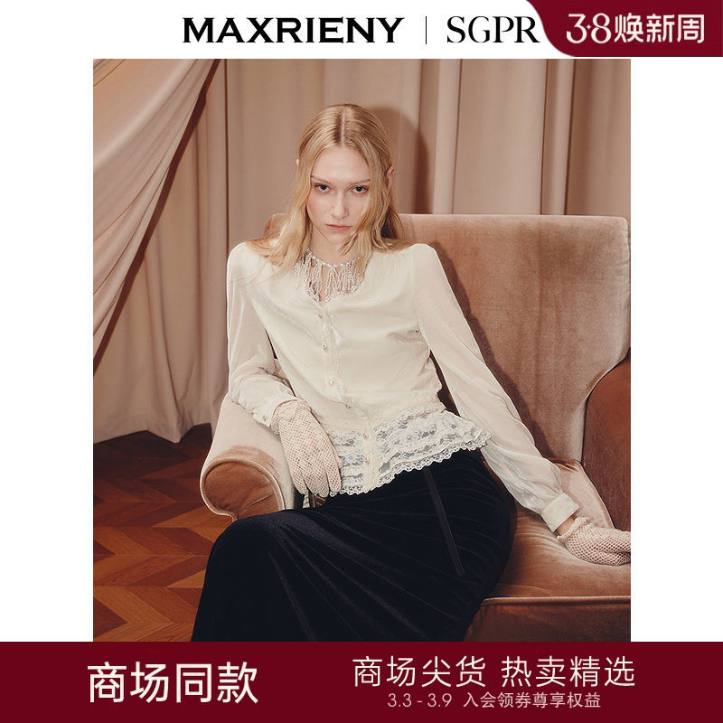 【SGPR】法式复古丝绒蕾丝衬衫25秋款v领长袖上衣女年末晚会穿搭