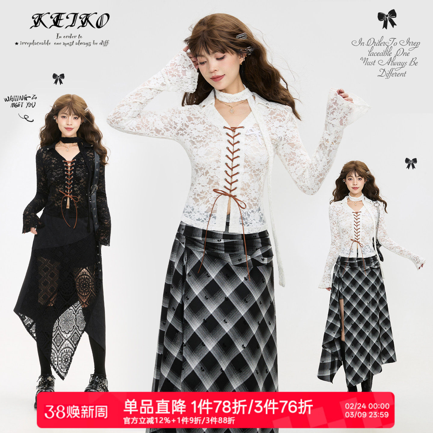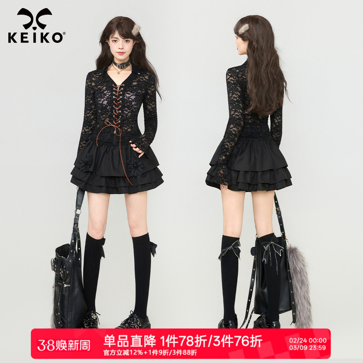 KEIKO 重工镂空浮雕蕾丝衬衫26春季暗黑哥特绑带V领修身收腰上衣