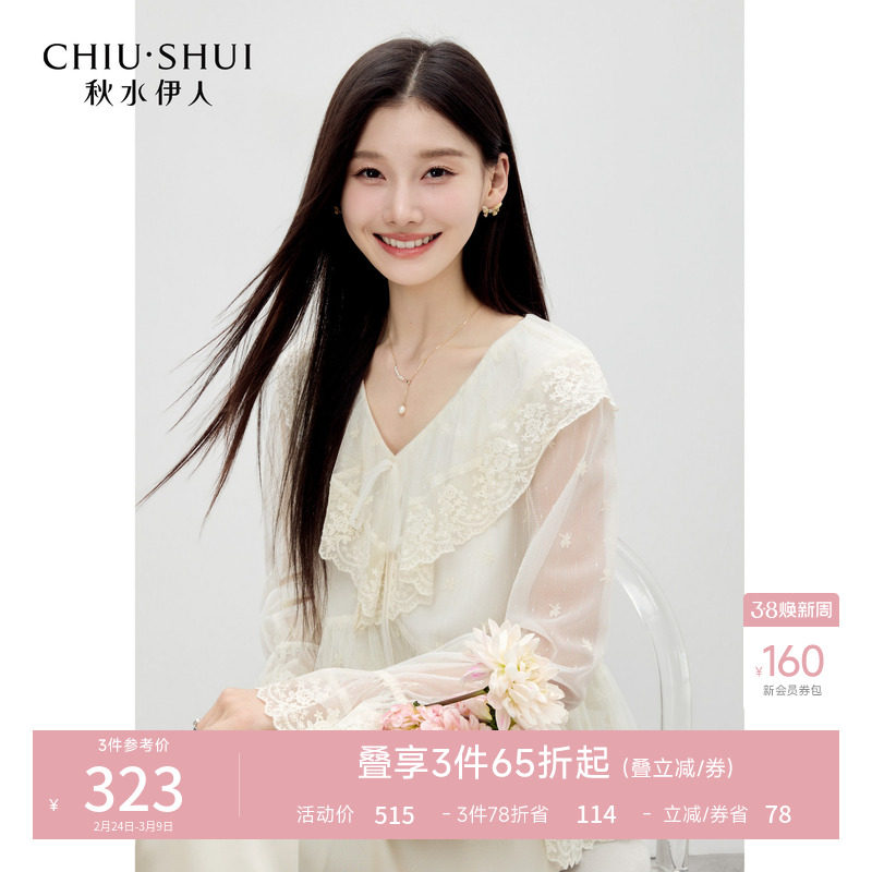 秋水伊人典雅复古V领蕾丝灯笼袖雪纺衫2026春季新款休闲蕾丝衬衫