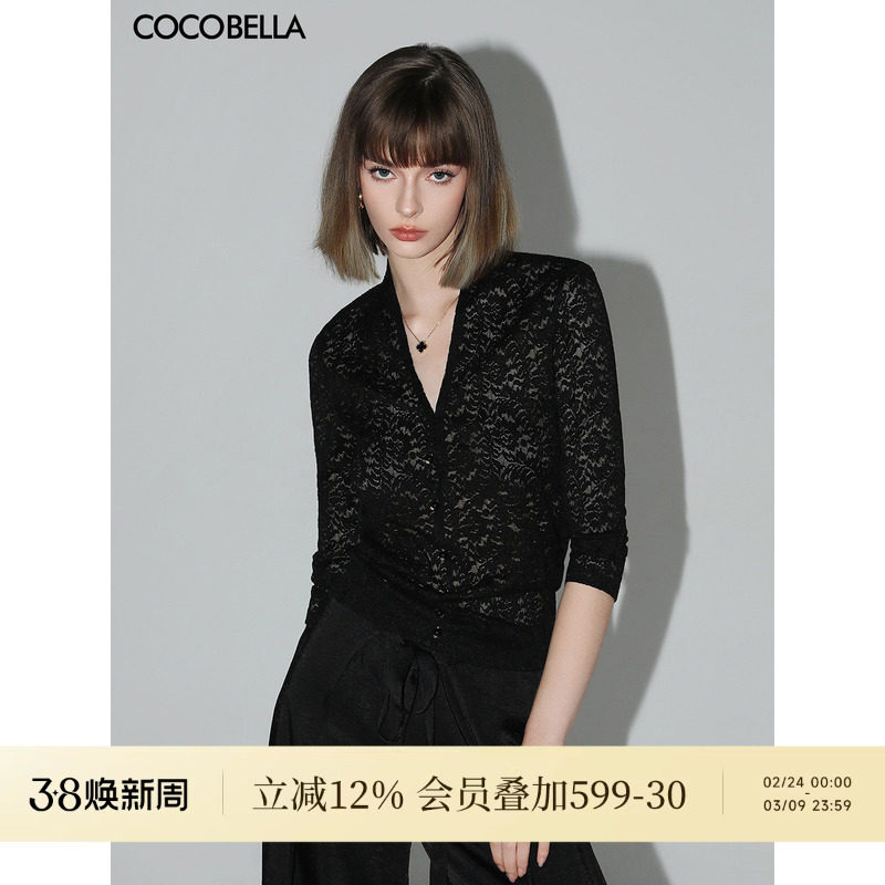 COCOBELLA优雅微透视镂空蕾丝衬衫女深V领长袖针织衫NLC55