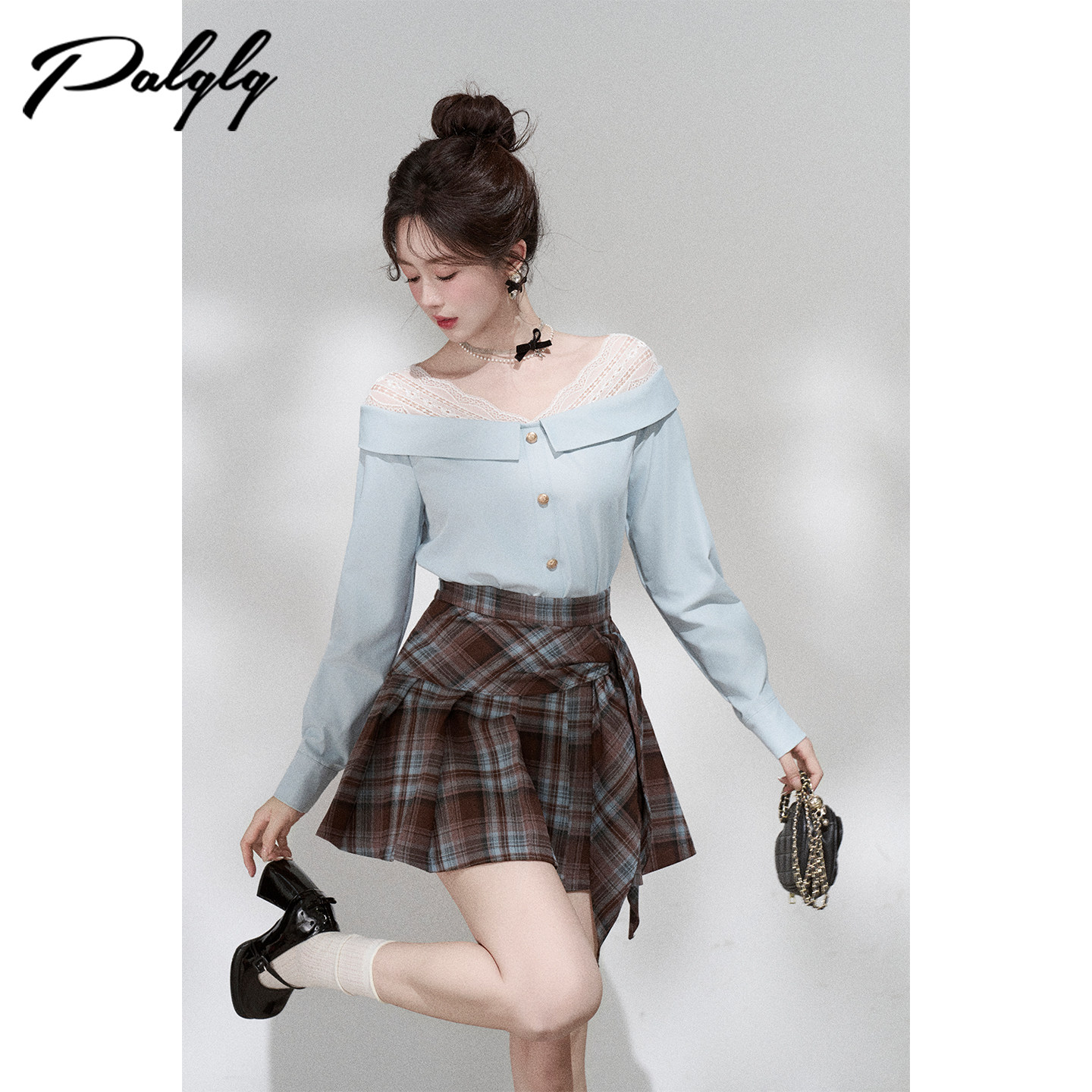 Palglg设计感小众蓝色一字肩蕾丝衬衫女早春季高级感宽松法式上衣