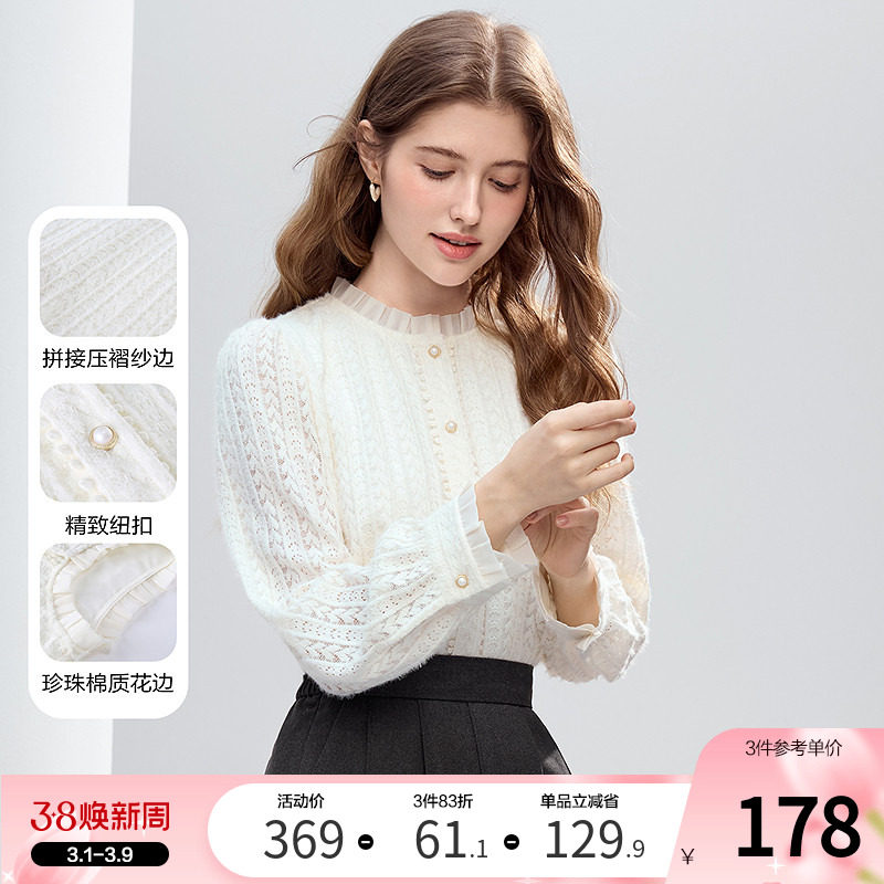betu百图蕾丝衬衫款气质蕾丝提花荷叶边小立领泡泡袖女式衬衫