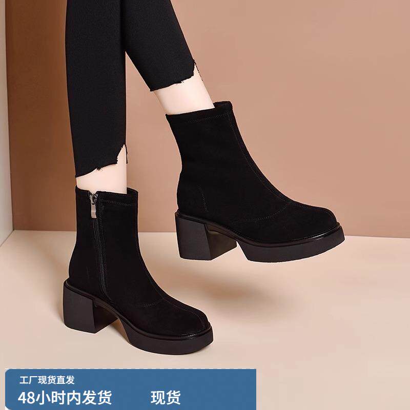 2025新款秋冬季女鞋高跟鞋绒面粗跟短靴时尚磨砂羊皮靴子真皮女靴