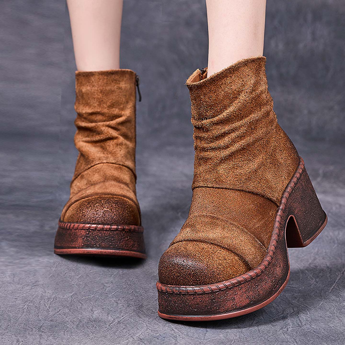 真皮版~短靴粗跟磨砂西部靴秋冬季高跟堆堆靴复古百搭褶皱骑士靴