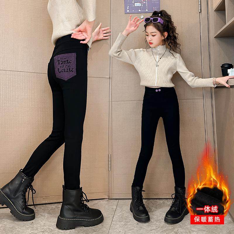 女童加绒打底裤秋冬外穿儿童黑色弹力铅笔裤大童加厚一体绒牛仔裤