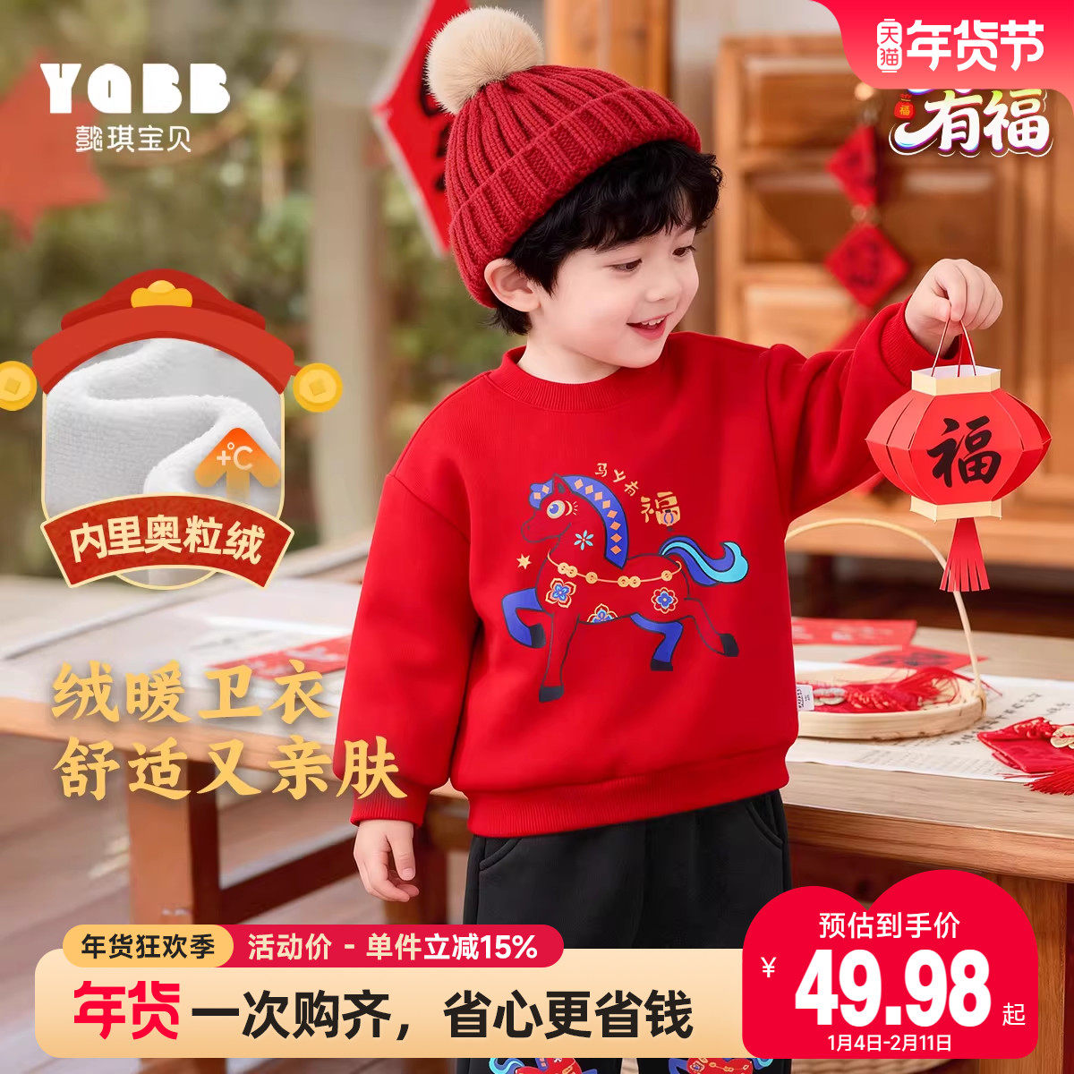 拉夏贝尔男童加绒卫衣2026马年本命年红色衣服半高领男宝宝拜年服