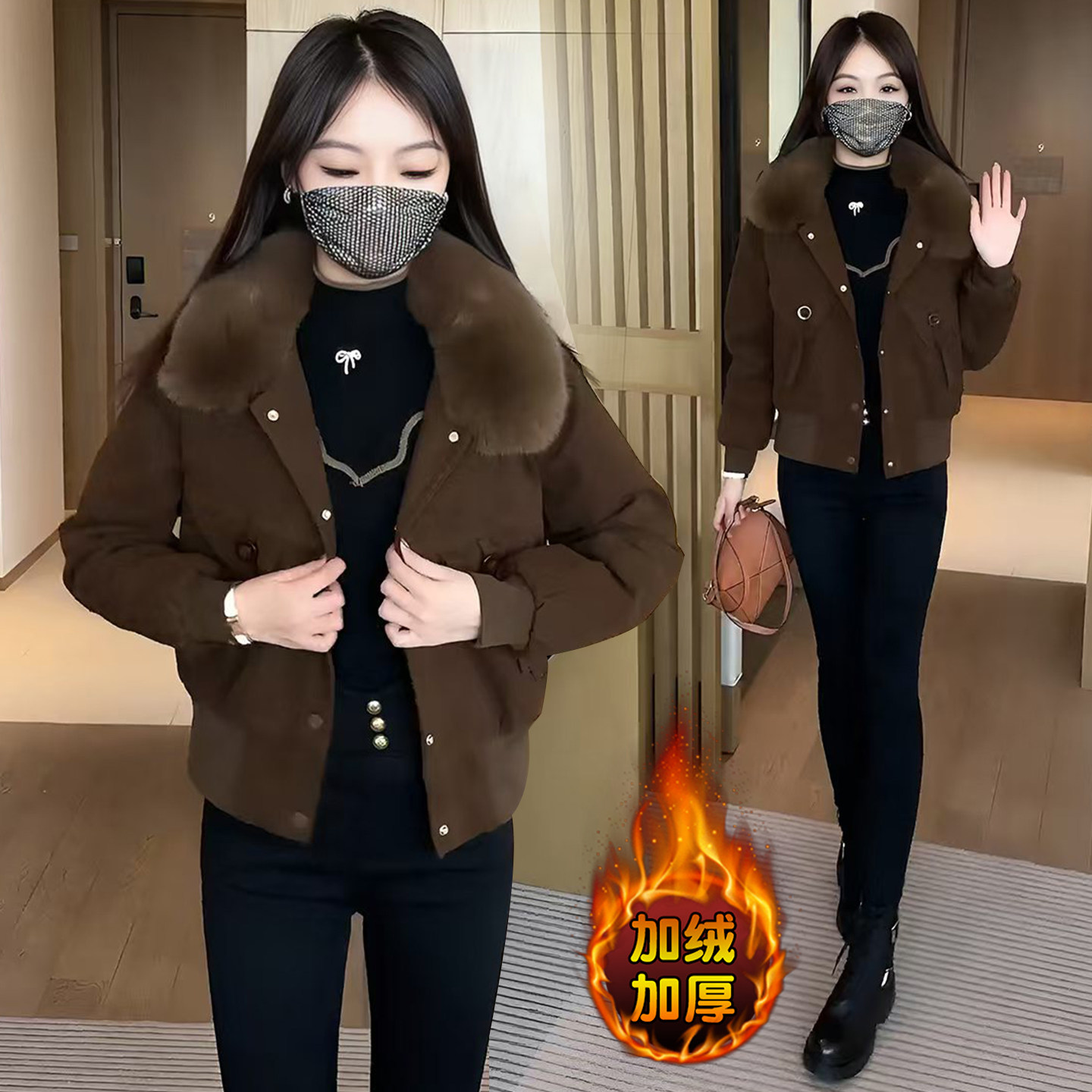 时尚休闲小个子短款加绒外套女秋2025秋冬新款洋气带毛领开衫上衣