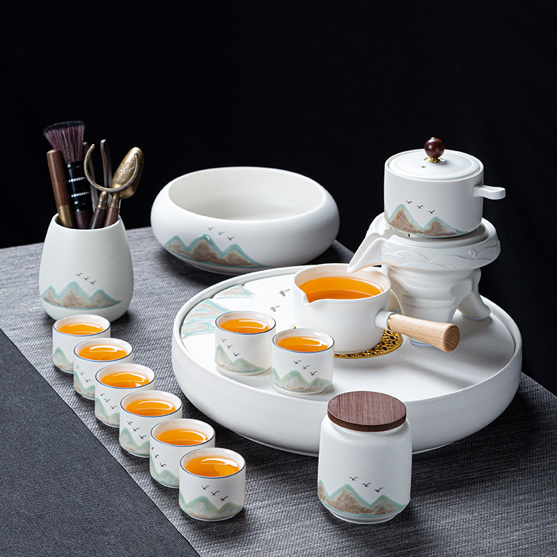 手绘远山懒人功夫茶具套装家用防烫泡茶壶陶瓷茶杯石磨半自动冲茶