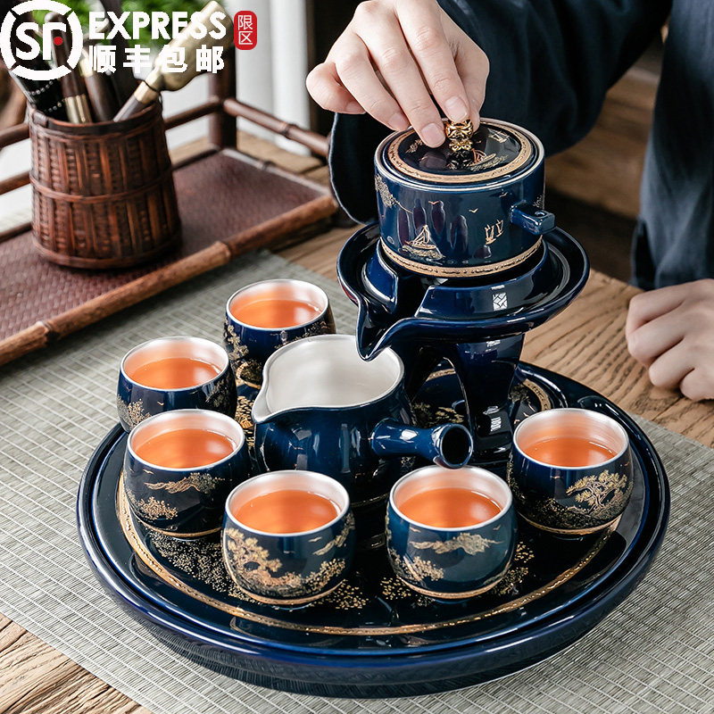整套青花瓷鎏银茶具套装家用时来运转懒人石磨自动冲茶泡茶器茶杯