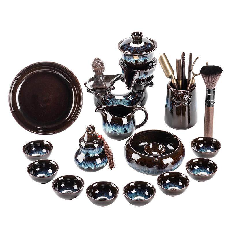 高档高档懒人自动功夫具半套自动旋转茶出水石磨装茶具窑变七彩礼