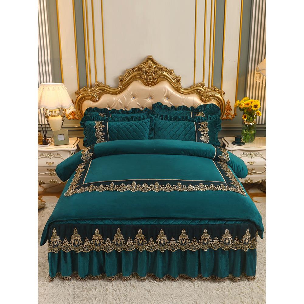 冬季夹棉牛奶绒床裙公主风蕾丝花边床盖床单绗缝加绒床罩三四件套