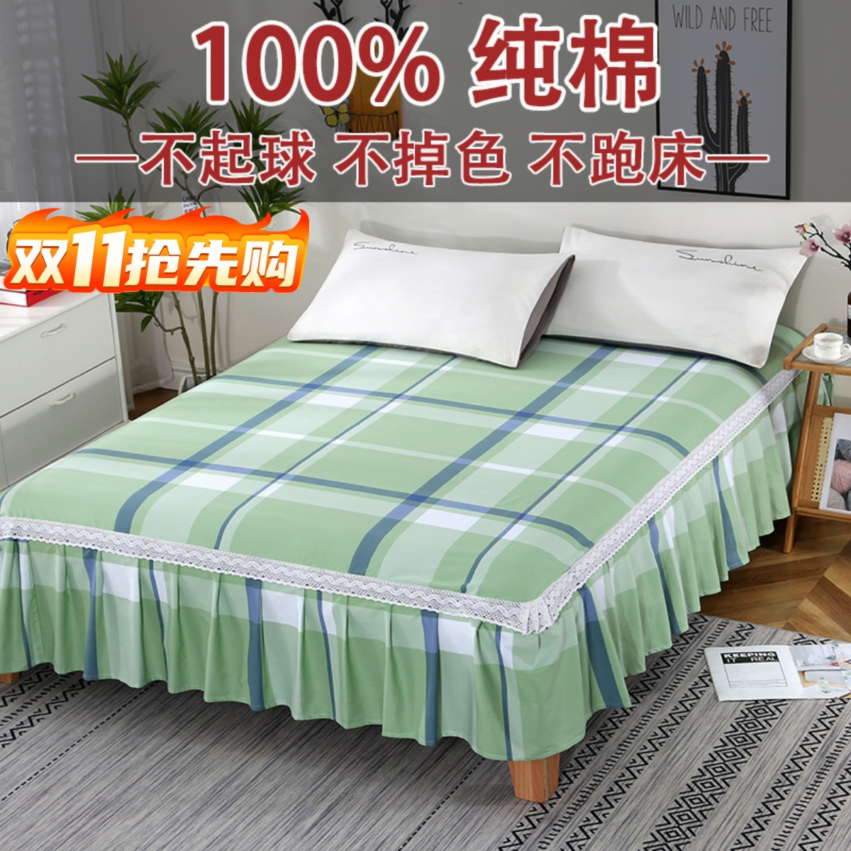 全棉磨毛床裙床罩纯棉花边床单床套防滑带裙边床围裙罩被套四件套
