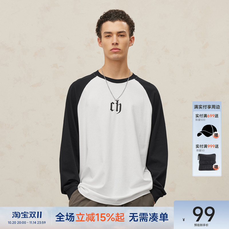 CH插肩袖撞色圆领长袖T恤男秋季美式潮牌高街简约印花内搭打底衫
