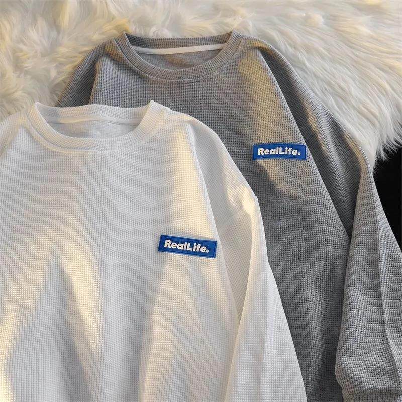 新款韩版宽松百搭圆领华夫格t恤女装内搭打底衫学生长袖卫衣女潮