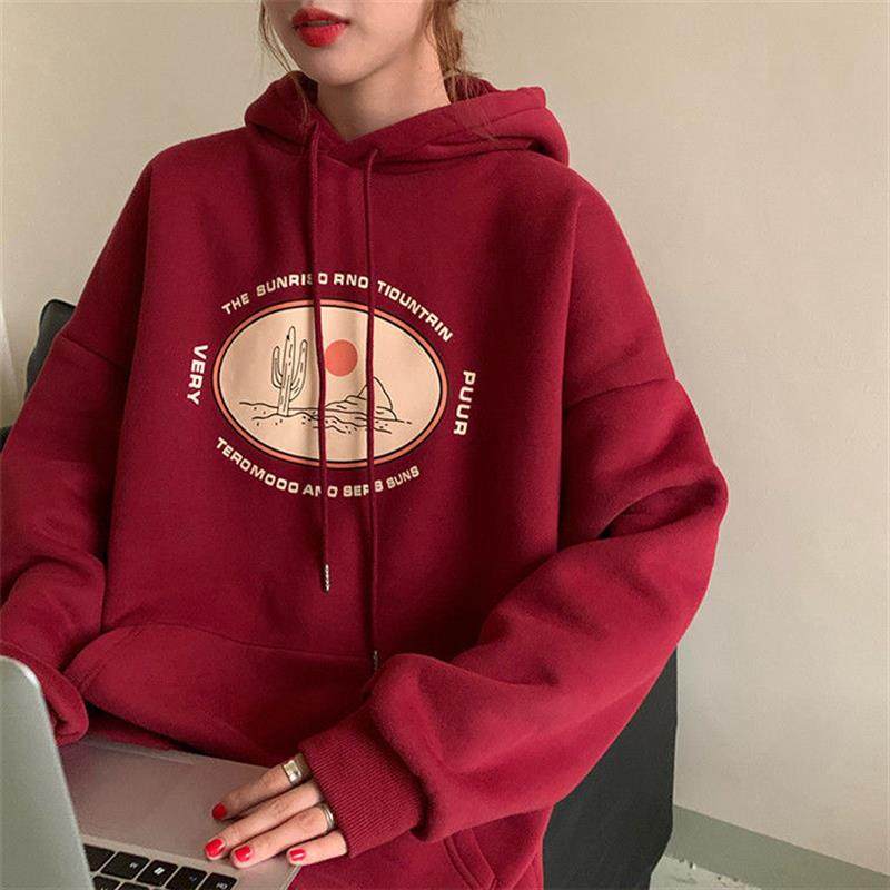 连帽高品质枣红色加绒加厚冬季卫衣女学生新款宽松百搭韩版外套潮