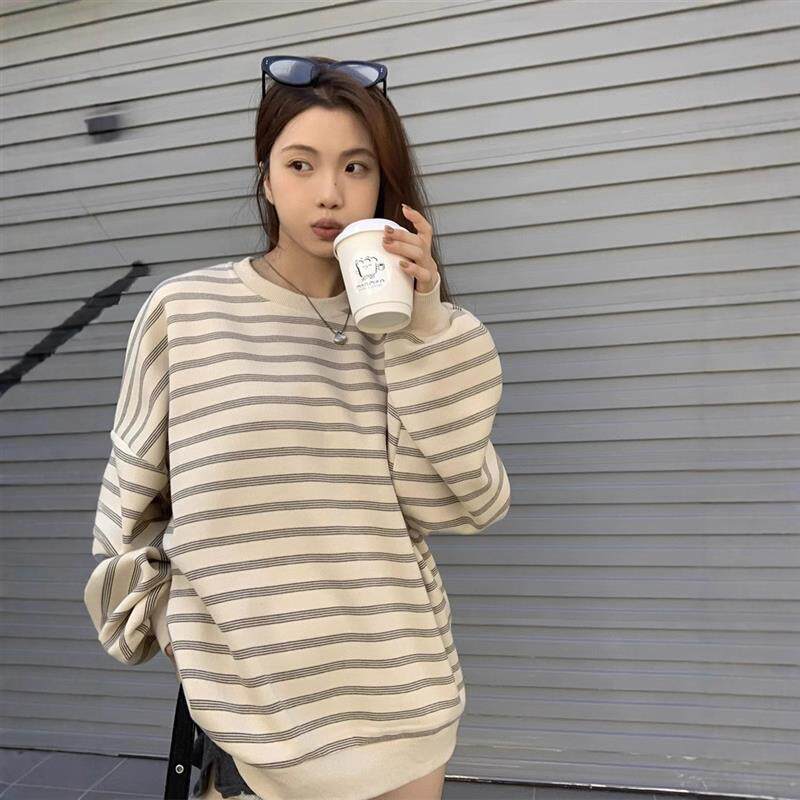 韩版条纹卫衣女秋季2025新款薄款宽松百搭显瘦休闲圆领学生上衣潮