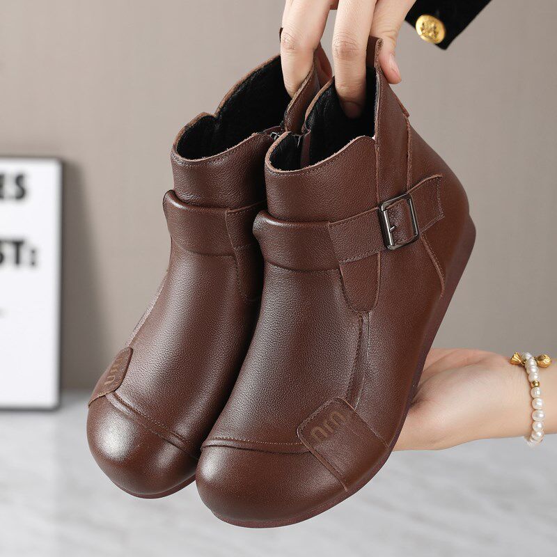 原创手工真皮复古短靴加绒文艺妈妈女鞋圆头烟筒靴平底休闲单靴女