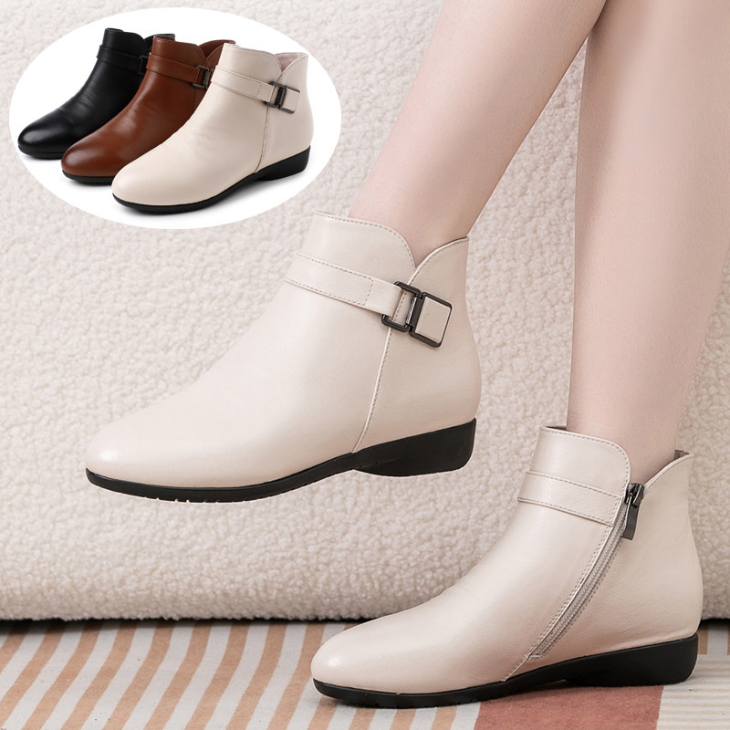 真皮软底短靴春秋软皮舒适中年妈妈鞋大码平底女靴米白色圆头单靴