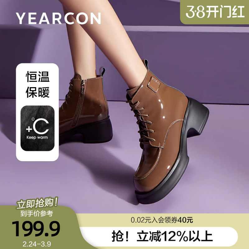 意尔康真皮短靴女2025秋冬粗跟小个子厚底增高马丁靴亮面圆头单靴