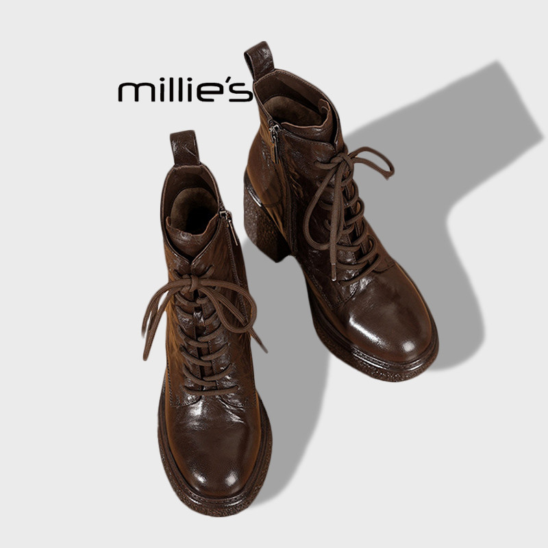 MILLIE'S/妙丽秋冬短靴圆头单靴粗高跟轻软舒适厚底马丁靴女皮靴Z