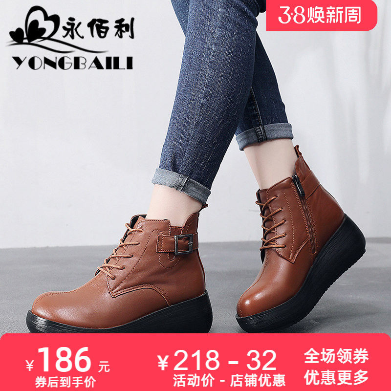 小婉品质头层牛皮短筒靴女秋冬厚底松糕底系带休闲复古大圆头单靴