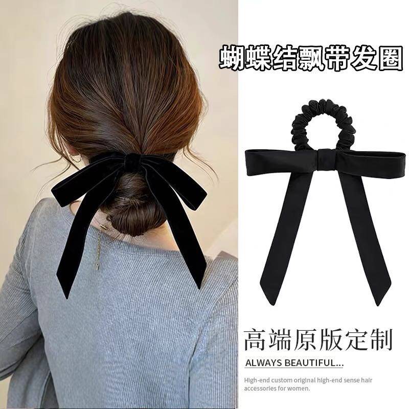 2026春夏新款珠光缎面蝴蝶结流苏飘带大肠发圈简约气质发绳马尾圈