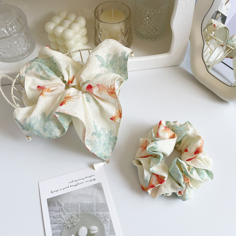 原创手作发饰新中式大肠圈锦鲤印花方巾发圈发绳流苏头饰丸子头花