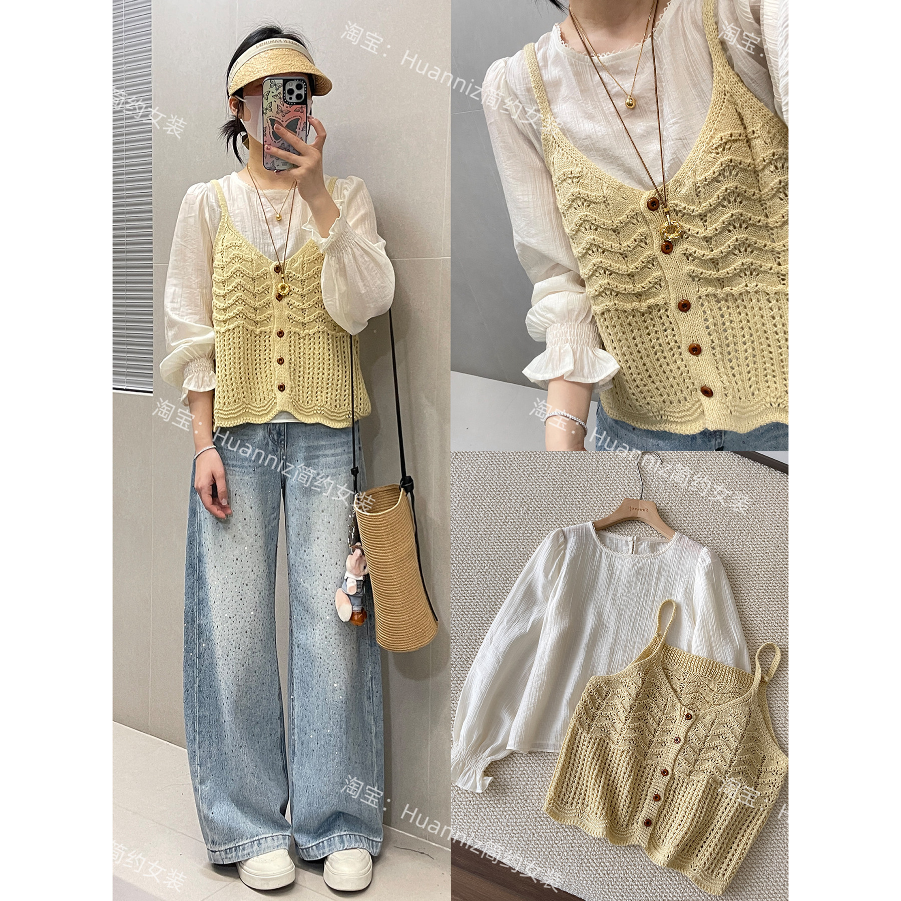 pusumede 松弛韩系透气披肩针织马甲背心两件套女夏v领无袖上衣